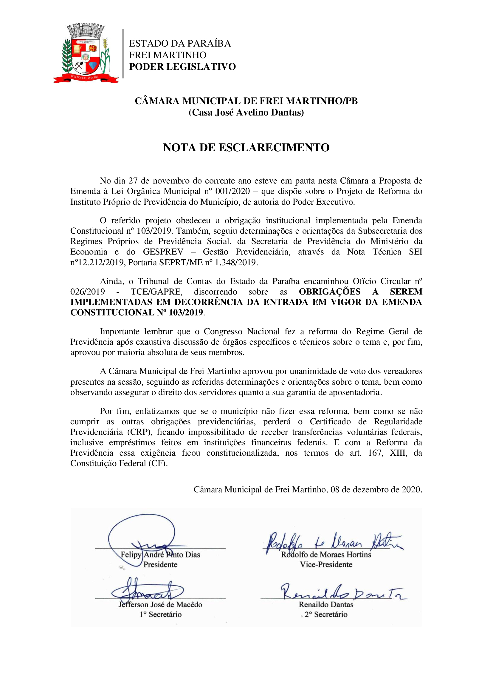Nota de Esclarecimento sobre a Emenda à Lei Orgânica Municipal nº 001/2020 de autoria do Poder Executivo.